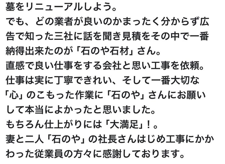 でも、どの業者が良いのか全く分からず、広告で知った3社に話を聞き見積もりをその中で一番納得できたのが「石のや石材」さん。